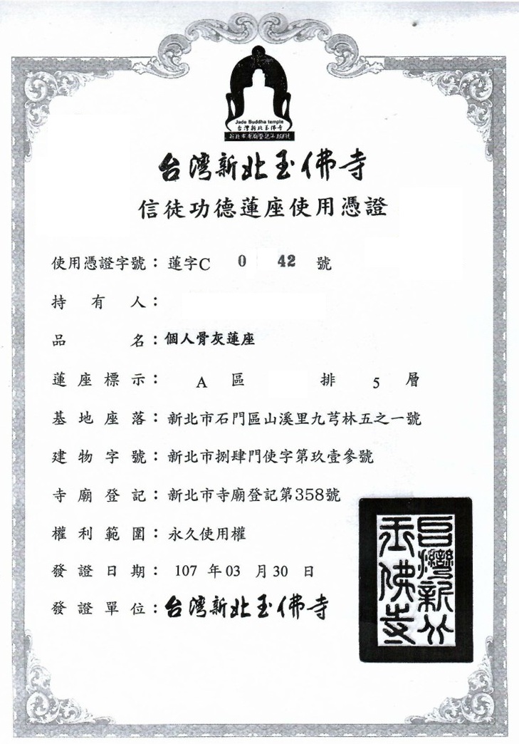 新北玉佛寺 個人骨灰蓮座 28萬/個